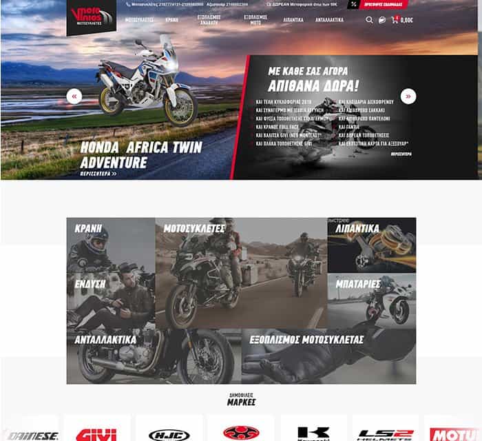 Όπως είναι γνωστό, μία φωτογραφία ίσον χίλιες λέξεις, γι αυτό και το site που σχεδιάσαμε καλύπτει από άκρη σε άκρη την οθόνη, ώστε τα προβεβλημένα προϊόντα να είναι ιδιαίτερα ευδιάκριτα και εντυπωσιακά. Δεδομένου του αντικειμένου της motovinios, προσθέσαμε animations στα κεντρικά banners για να αναδείξουμε τόσο την “κίνηση” των προϊόντων της όσο και τη δυναμική, το όραμα και την αποφασιστικότητα της Moto Vinios για καθιέρωση του ηγετικού της ρόλου στο μηχανοκίνητο χώρο.