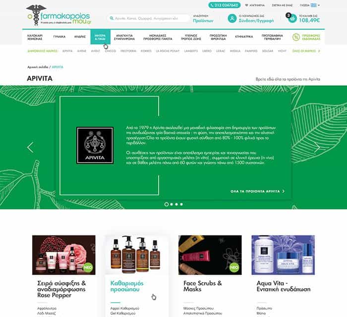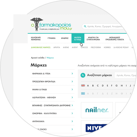 Το design αποτέλεσε μία από τις πρώτες προκλήσεις του project. Έπρεπε να δοθεί ιδιαίτερη προσοχή στη λεπτομέρεια, ώστε να μπορέσουμε να αναδείξουμε ένα σύγχρονο και "καθαρό" e-shop, διατηρώντας το ύφος και την ταυτότητα που είχε χτίσει ο πελάτης όλα αυτά τα χρόνια. Δώσαμε τεράστια έμφαση στη χρηστικότητα, ώστε ο επισκέπτης να μπορεί να βρίσκει άμεσα αυτό που επιθυμεί, ξεκινώντας από το στήσιμο του μενού με τις εκατοντάδες κατηγορίες του φαρμακείου. Επίσης, φροντίσαμε να παρέχουμε άμεση πρόσβαση στις δημοφιλέστερες μάρκες, αλλά και στις αμέτρητες προσφορές του site, ώστε ο χρήστης να μπορεί να βρει εύκολα και γρήγορα αυτό που επιθυμεί.